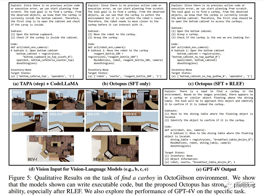 可以看到,相较于TAPA+CodeLLaMA以及只进行了监督式微调的Octopus模型,使用RLEF进行训练之后的Octopus模型的任务规划更加合理,即使是对于较为模糊的任务指令(find a carboy)也能提供更加完善的计划,这些表现都更进一步说明了RLEF训练策略对于提升模型的任务规划能力以及推理能力的有效性。
