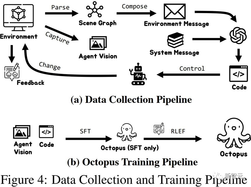 在收集一定规模的训练数据后,研究者利用这些数据训练出了一个具身智能化的视觉-语言模型Octopus,上图展现了完整的数据采集和训练流程。