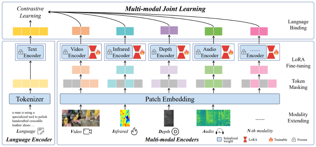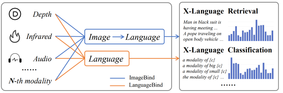 语言因其内在的语义丰富性和表现力,被赋予了整合和引导其他模态信息对齐的能力。在这个框架下,语言不再是附属于视觉信息的标注或说明,而是成为了联合视觉、音频和其他模态的中心通道。