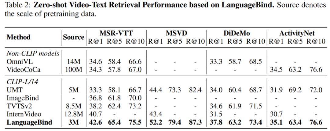 表 2 显示,LanguageBind 的性能在 MSR-VTT 上超过 VideoCoca 和 OmniVL ,尽管仅使用 300 万个视频 - 文本对。