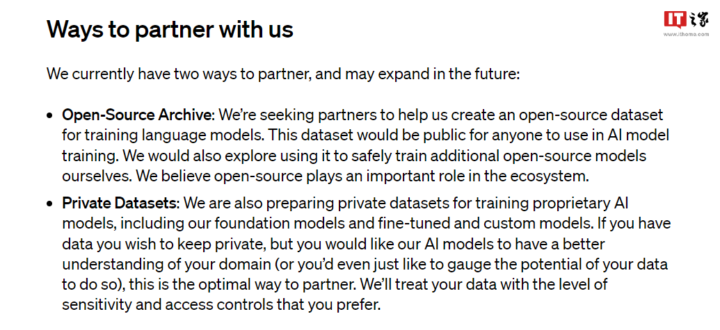 IT之家 11 月 10 日消息,OpenAI 发文宣布,将与组织合作生成用于训练 AI 模型的公共 / 私有数据集,数据合作伙伴关系旨在“让更多组织能够帮助引导 AI 的未来”并“从更有用的模型中受益”。