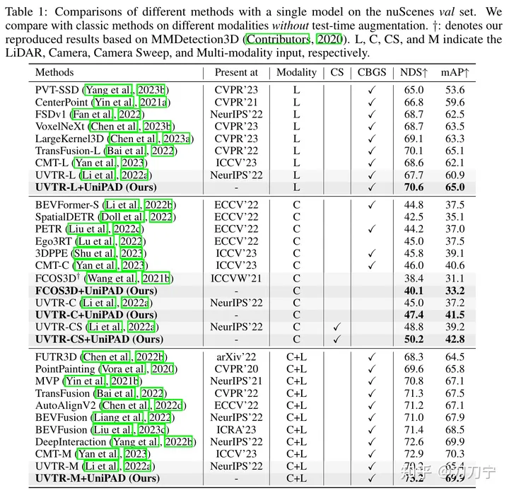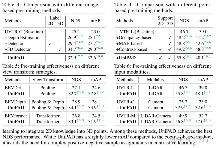 在我们的实验中,UniPAD的优越性得到了充分体现。相较于传统的激光雷达、摄像头,以及激光雷达-摄像头融合基线,UniPAD 分别提高了 9.1、7.7 和 6.9 的 NDS 。值得一提的是,在nuScenes验证集上,我们的预训练流程为3D目标检测实现了73.2的NDS,并在3D语义分割任务上取得了79.4的 mIoU 分数,与之前的方法相比,取得了最好的成绩。
