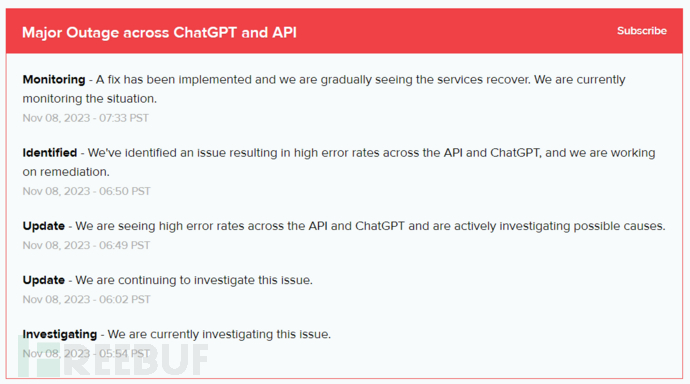随着对“宕机”事件的讨论越来越多,OpenAI 方面迅速对此次事件作出回应,并将事件定义为“严重停机”,北京时间 21 点 54 ,OpenAI 宣布服务出现问题,晚上 23 点 33 分,OpenAI 确认已进行修复,服务开始逐渐恢复。