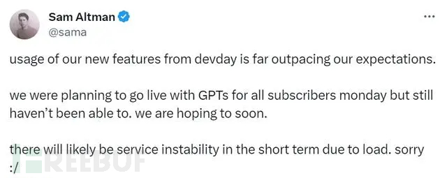 “宕机”事件发生后,OpenAI CEO 山姆·奥特曼在X (原推特)上公开致歉,并表示短暂宕机的原是本周发布的新功能,可能遇到远超预期的使用量。山姆·奥特曼还强调原计划下周一为所有订阅者重新启用 GPT 服务,但以目前的情况来看,可能暂时无法实现。