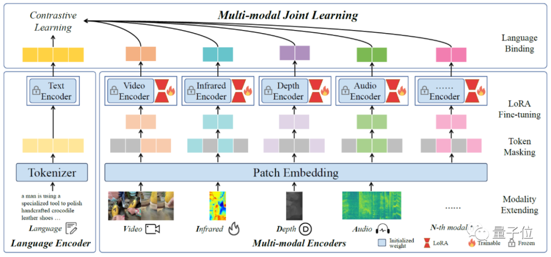 将LanguageBind方法扩展到多个(N个)模态的第一步是将数据处理成令牌序列。随后,参数将从OpenCLIP进行初始化。然后通过令牌屏蔽和LoRA微调来训练不同模态的编码器,同时保持语言编码器冻结。最后,将该模态与语言特征空间对齐。