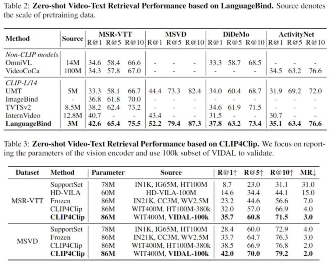 在测试阶段,大量的实验验证了VIDAL-10M数据集和LanguageBind方法的有效性,在视频、音频以及其它模态理解任务中取得了显著的性能。