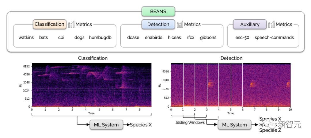 BEANS((the BEnchmark of ANimal Sounds,动物声音的基准)是一个生物声学任务和公共数据集的集合,专门用于测量生物声学领域机器学习算法的性能,包括生物声学中的两个常见任务:分类和检测。