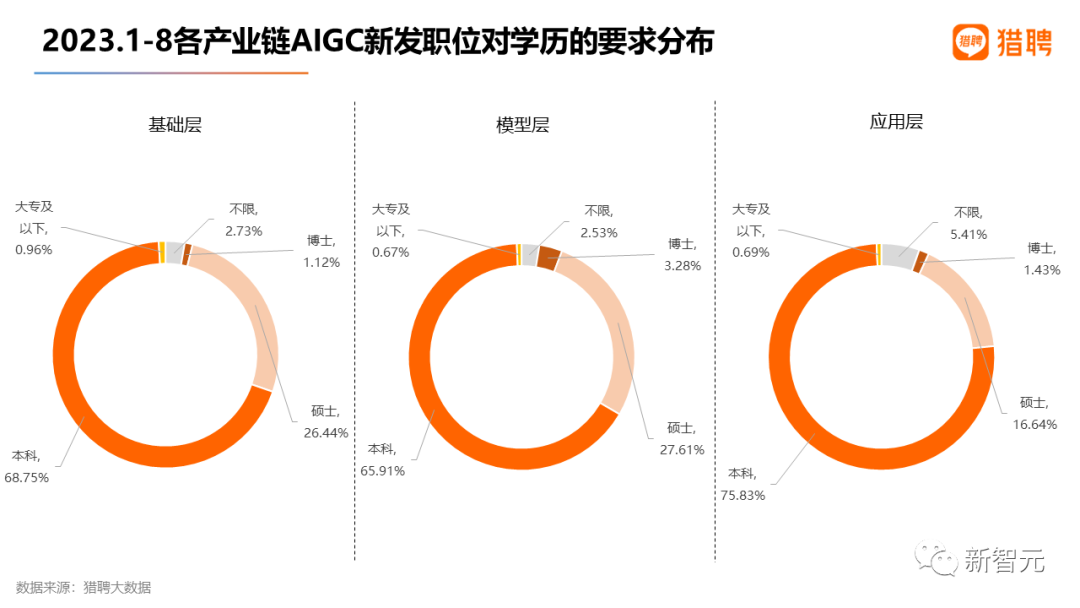 由于基础层和模型层更加侧重技术,因而职位对学历的要求也更高。