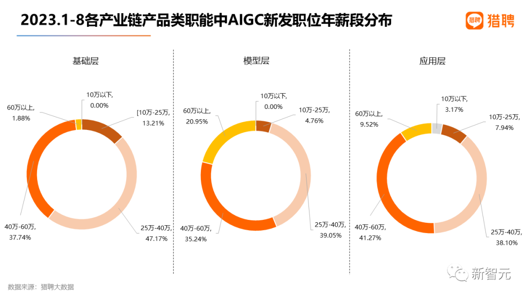 据统计,模型层60万以上的职位占比甚至达到了20.95%,远远高于基础层的1.88%和应用层的9.52%。