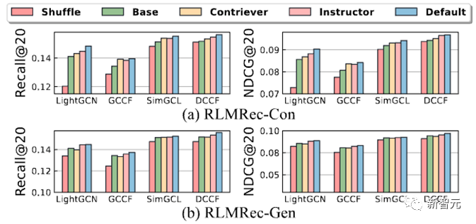 同时我们也利用了不同的语义嵌入模型(Instructor、Contriever)来生成语义表征,我们发现越好的语义嵌入模型生成的语义表征能够更好的增益RLMRec。
