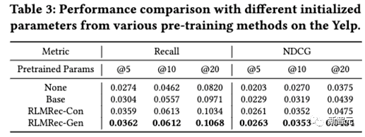 从结果中我们发现,在预训练的场景下,生成式对齐RLMRec-Gen一致的具有更优的性能,我们认为这是因为通过生成式建模中的掩膜(Mask)操作,能够有效防止过拟合,从而构成一种约束,因此所获的的参数能够有效迁移至新的数据上,这也与近年来通过生成式预训练语言模型的范式不谋而合。
