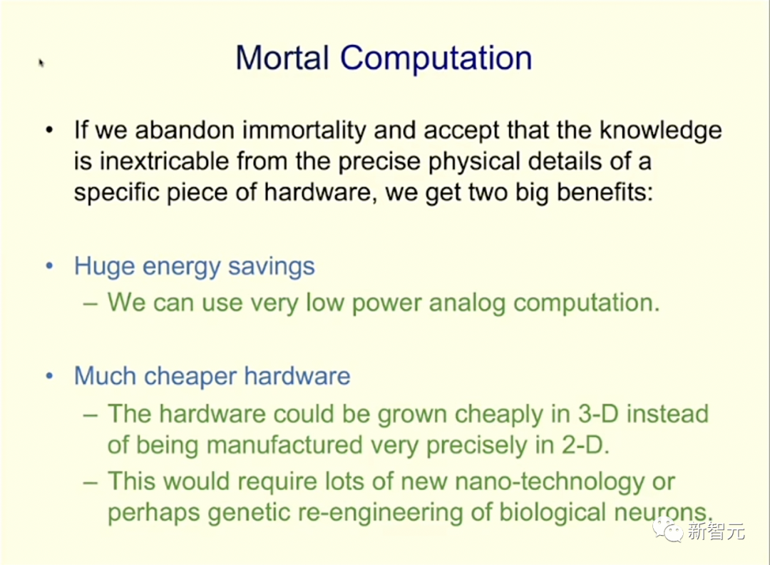 因为每个人工智能芯片获得的知识在被拆解时都会丢失,所以他称这种方法为「凡人计算(Mortal Computation)」。