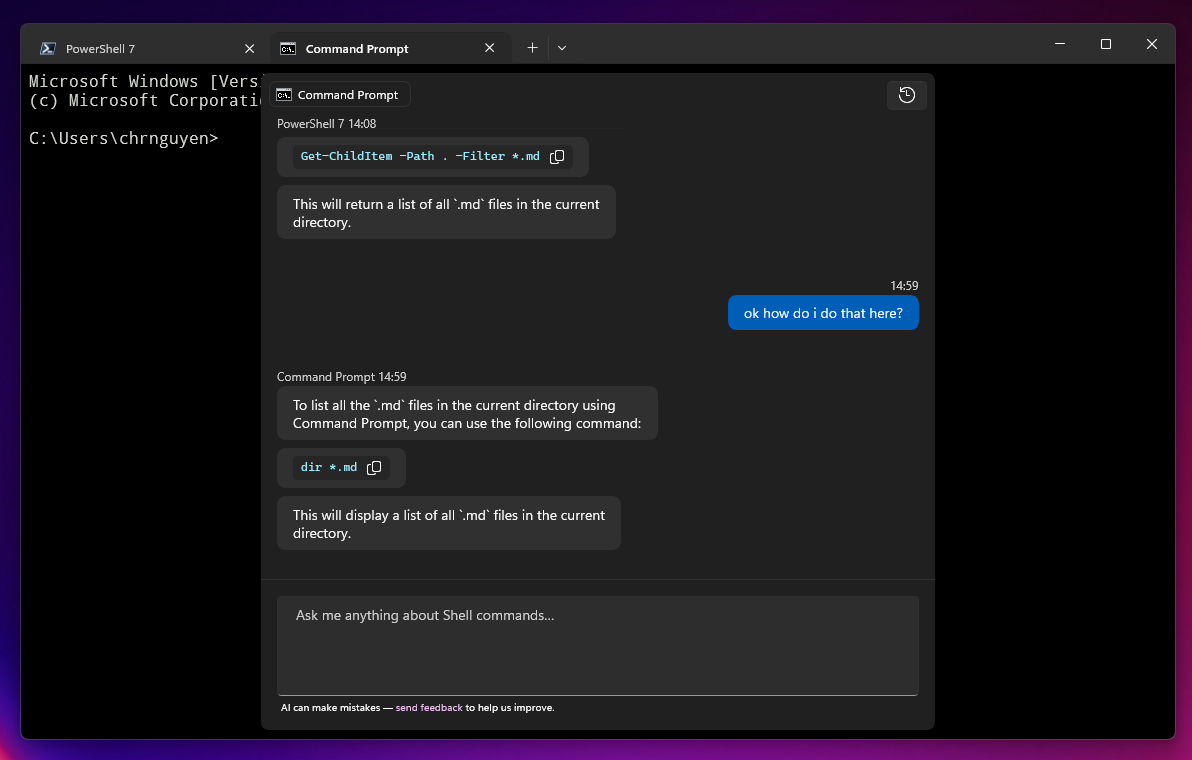 微软目前已经在 Canary 频道的 Windows Terminal 中,推出了 Terminal Chat 功能,让用户通过和 AI 的聊天,帮助查找命令或解释错误等任务。该 AI 服务不附带自己的大型语言模型,因此用户需要提供自己的大型语言模型。