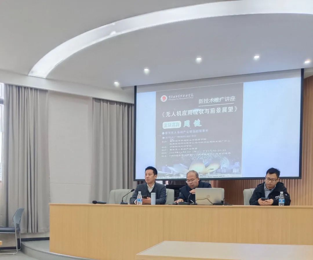 活动第一阶段,邀请重庆无人系统产业联盟副理事长、大广物联科技(深圳)有限公司CEO周健先生在商学苑报告厅举行《无人机系统应用现状与前景展望》专题讲座。