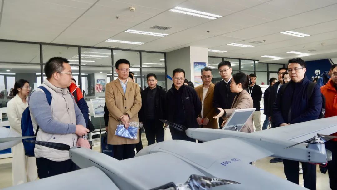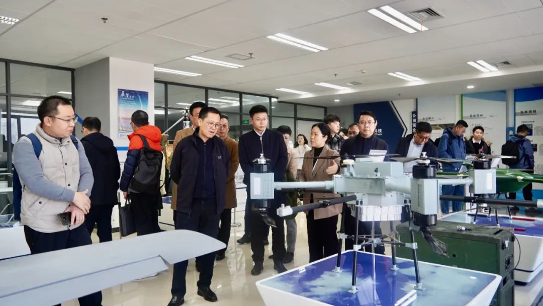 调研考察团首先参观了无人机展厅,详细了解了羚控科技自主研发的复合翼垂直起降、中大型固定翼、复合翼蜂巢、系留多旋翼等七大系列主要无人机的应用场景、性能参数。