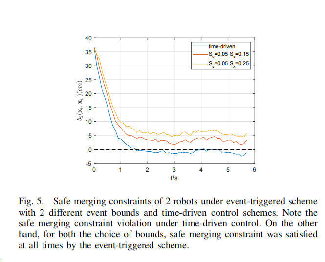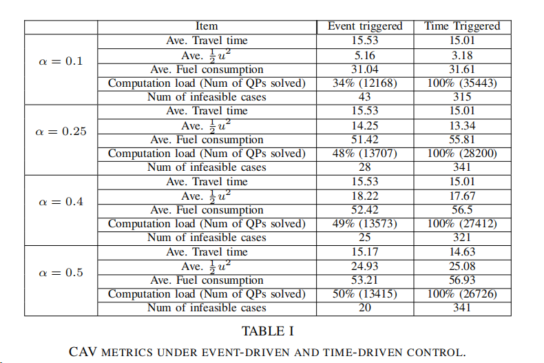 在仿真和实验平台上验证了提出的事件触发控制框架。使用松灵LIMO多模态机器人进行CAV模拟,并对比了事件触发控制与传统时间驱动方式在QP计算、不可行情况降低以及噪声环境下的性能差异。实验结果表明,事件触发控制相较于时间驱动方式,能够显著减少QP计算次数,并在实际噪声环境下保持对安全约束的有效控制。