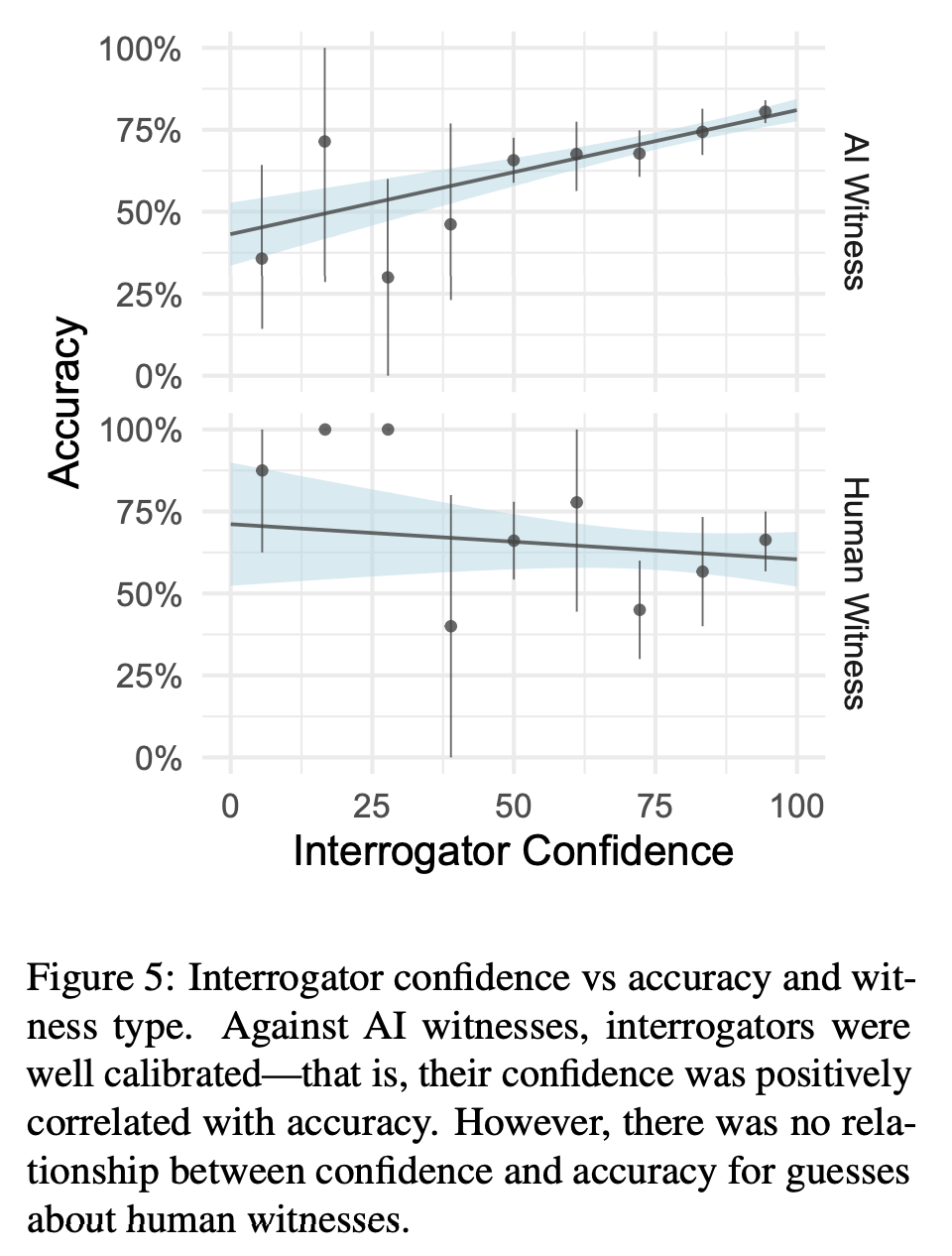 在人工智能游戏中,审问员的信心指数相当可观,但在人类游戏中,信心指数并不能预示准确性(见图 5)。