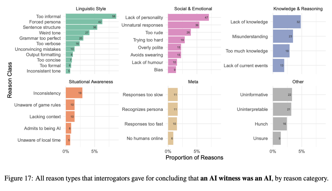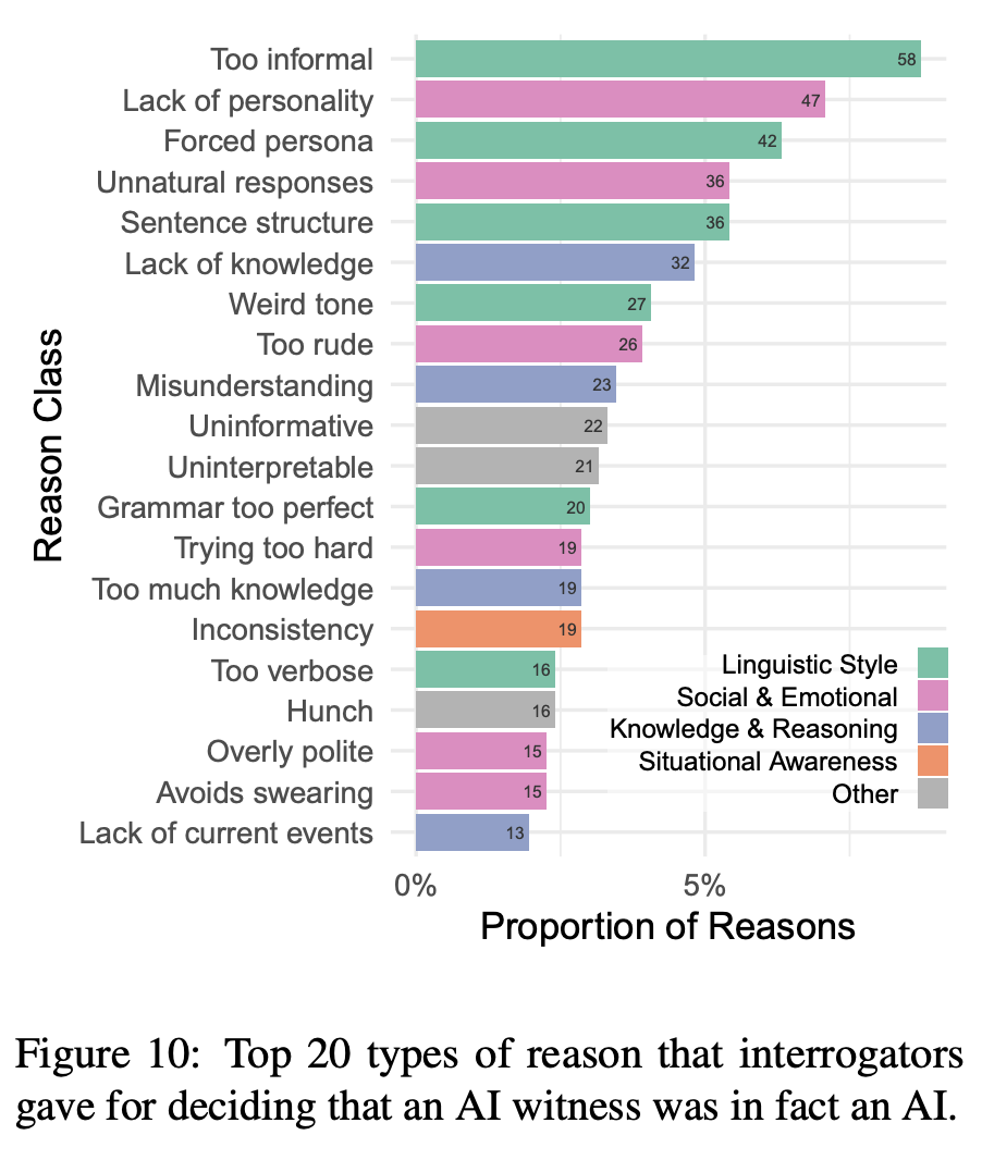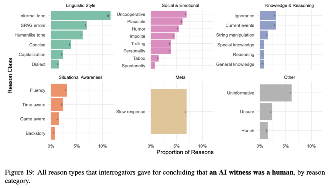 审问者经常把AI见证者误认为是人类一些原因是AI表现出来的非正式语调(例如俚语、缩写),但对真正的人类见证者,审问者很少认为这是判断是人类的原因。