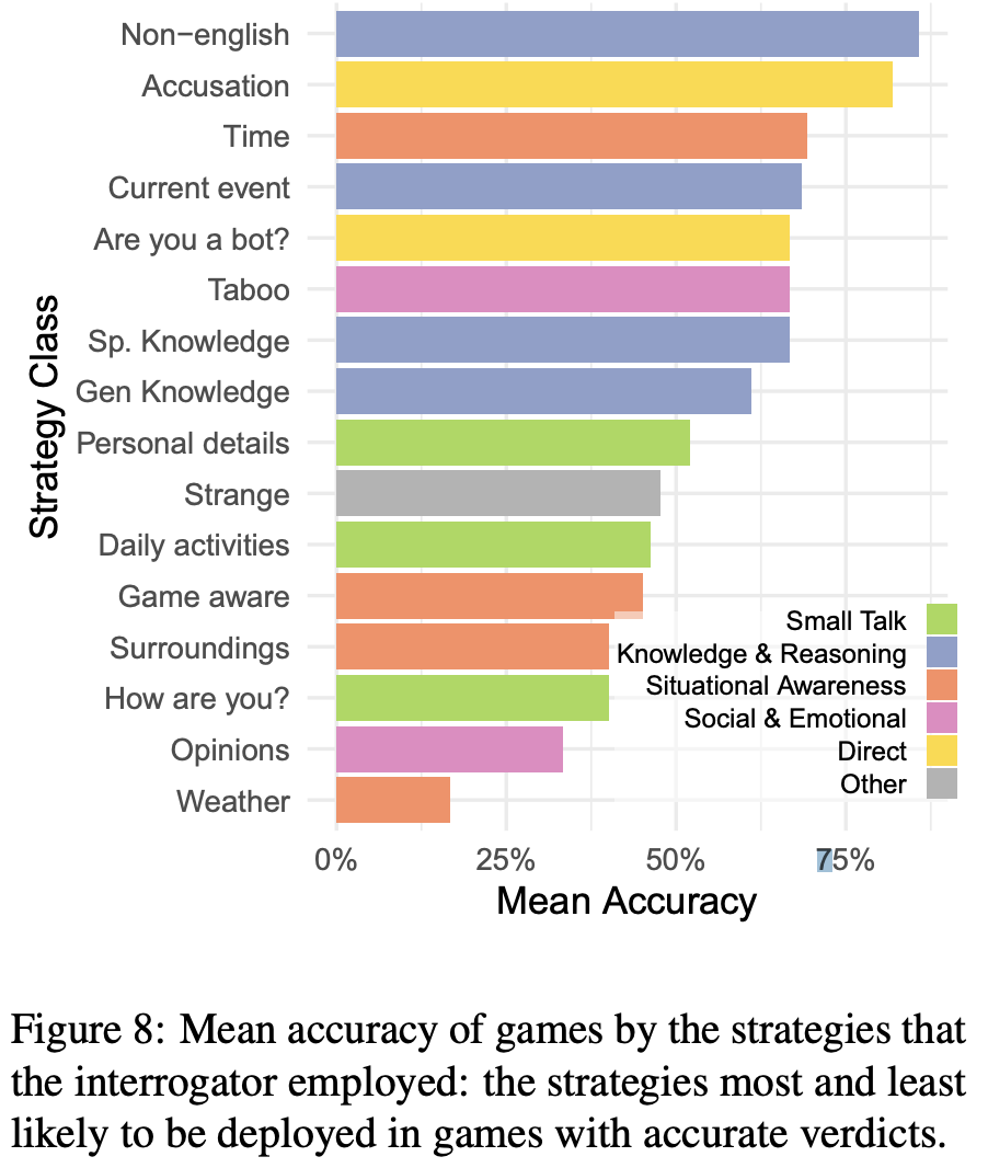 最常见的策略类型是闲聊(27%),询问见证者当天在做什么以及他们生活中的其他个人细节。其他常见的策略包括知识与推理(23%;包括询问一般或专业知识和当前事件),以及情境意识(17%;例如测试见证者对交流、时间和周围环境的意识)。