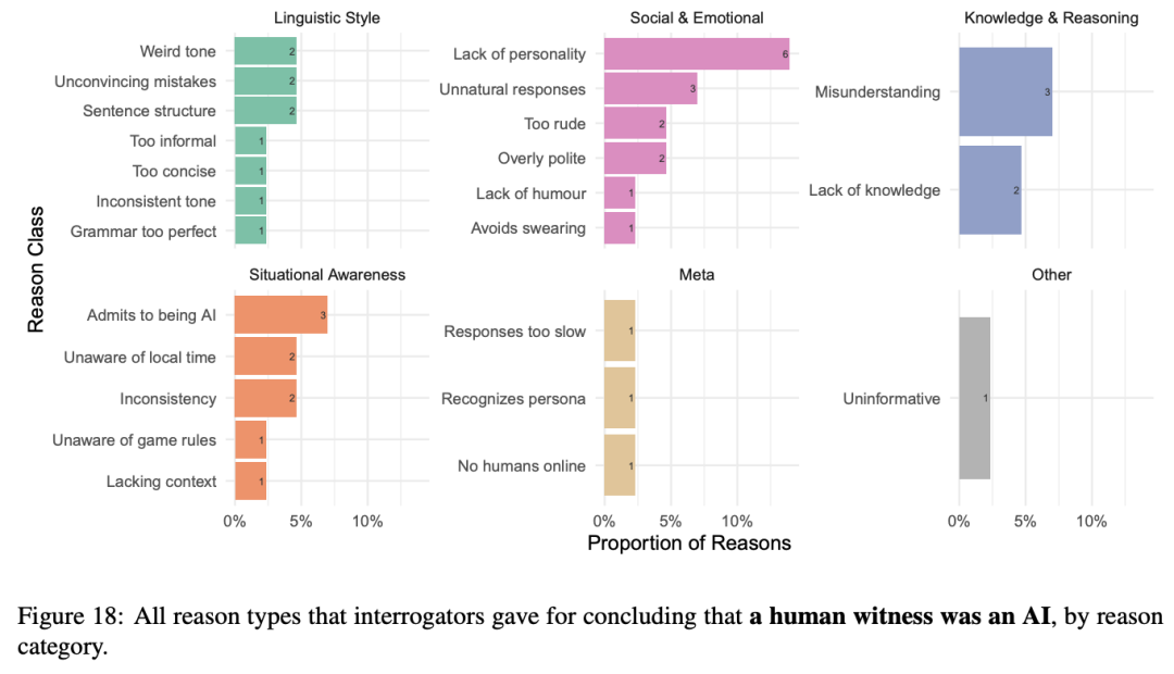 对于把人类认定为AI的原因,审问者经常提到的原因有:语言因素,如拼写和语法(SPAG)错误和「类似人类」的语调,以及社交情感因素,如幽默、可信度和不合作。