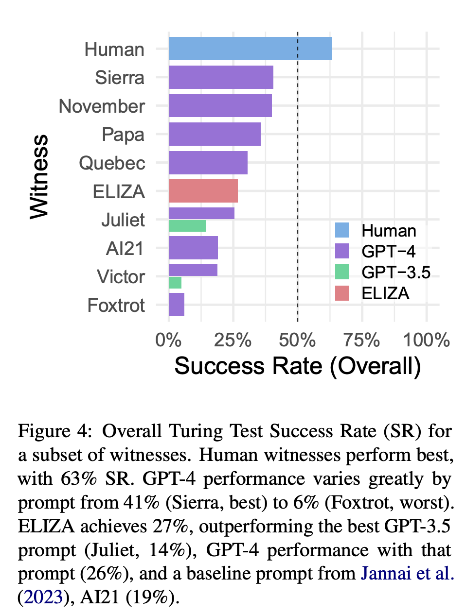 研究人员将成功率(SR)定义为,审问员判定证人为人类(即证人成功)的游戏比例。
