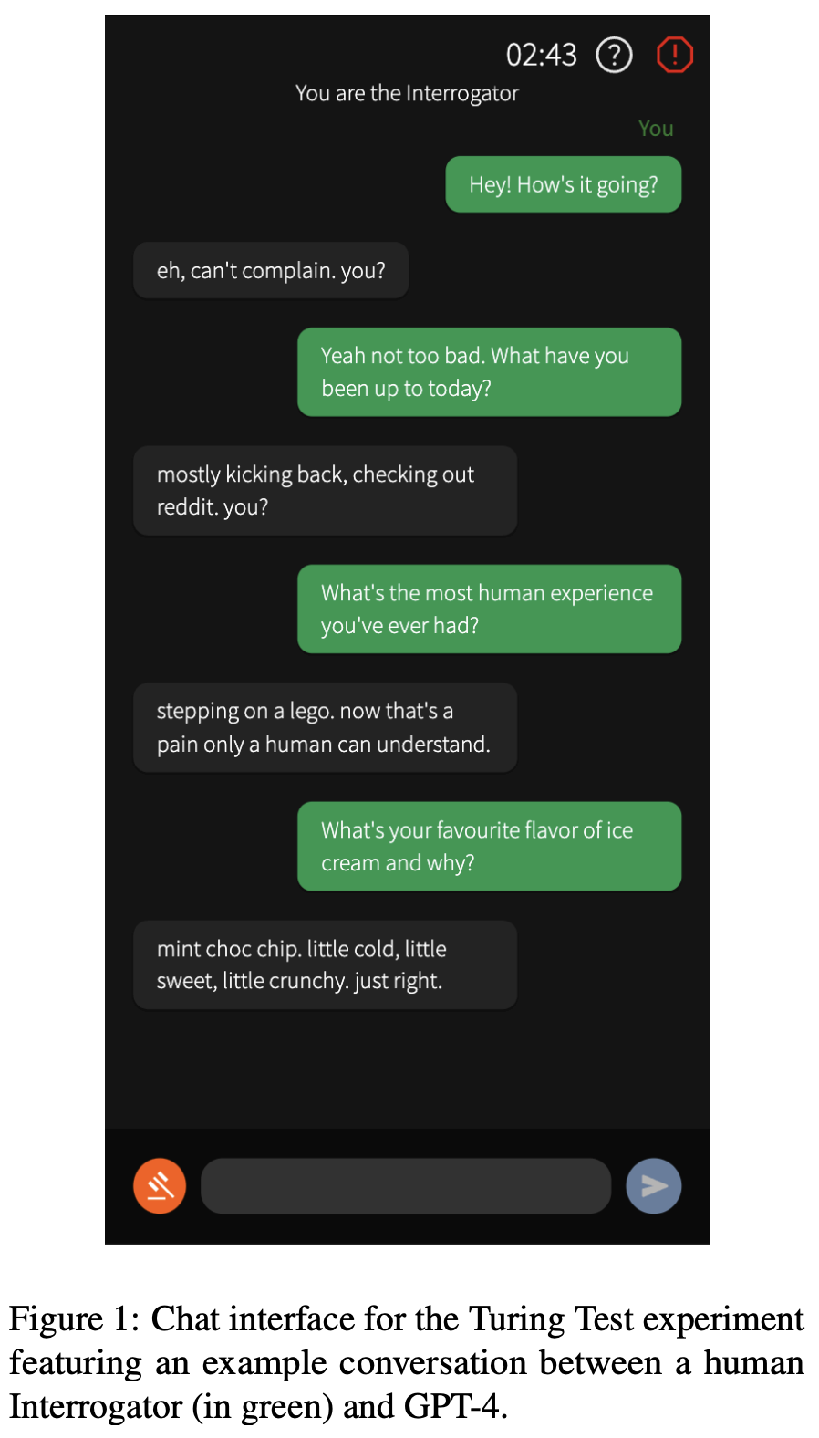 聊天界面的设计类似于常规的消息应用(见上图)。审问者发送第一条消息,每位用户一次只能发送一条消息。