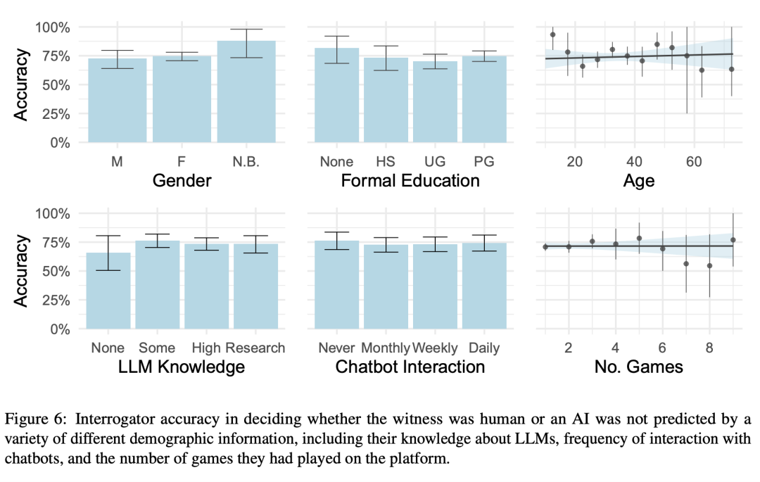 研究人员还测试了,已知影响人机交互的人口统计学因素,包括年龄、性别和受教育程度是否能预测调查员的辨别能力。