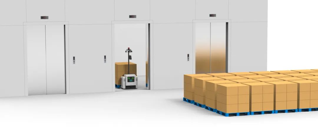 项目涉及1/3/4/5F的原料及成品的出入库,以往皆由人工进行跨楼层搬运,不仅费时费力,物料也难以追溯。在导入以「微蜂X20」为硬件载体的场内智能物流解决方案后,无人叉车和电梯梯控系统对接,实现乘梯换层自动化作业。