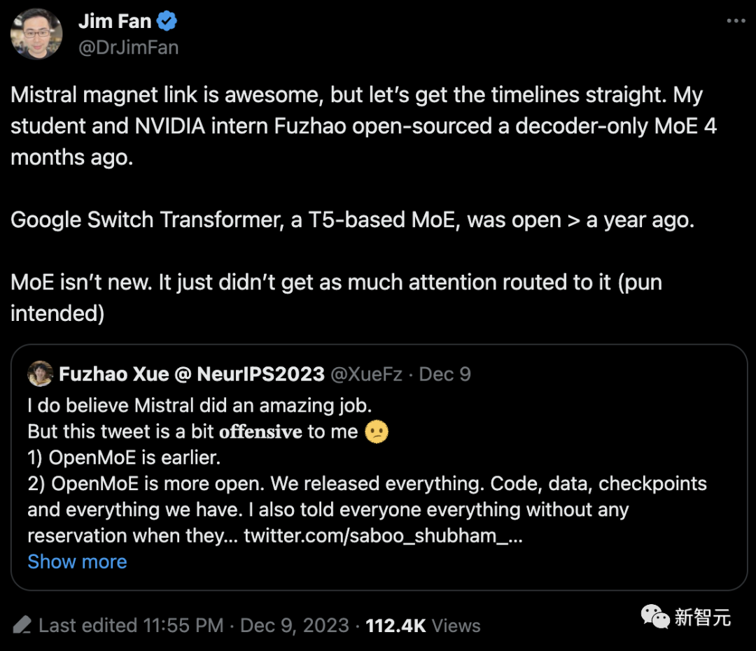 对此,Jim Fan也表示,MoE并不新鲜,它只是没有得到那么多关注而已......