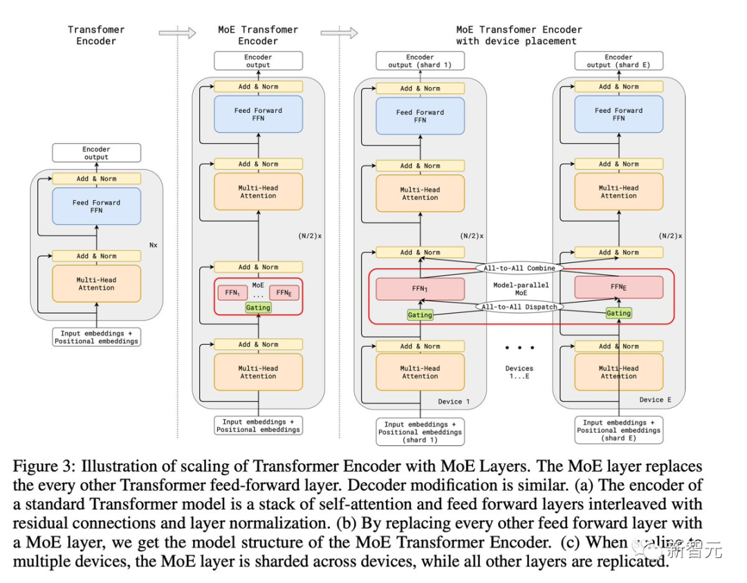 上图展示了具有MoE层的Transformer编码器的演化(对于解码器的修改也类似),MoE层取代了Transformer的前馈层。