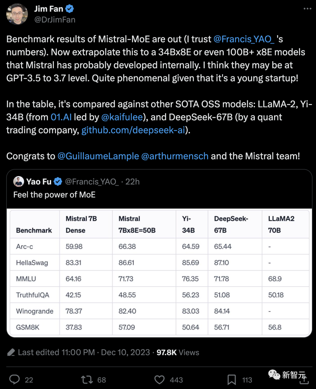 而根据Jim Fan猜测,如果Mistral内部训练了34B×8E或者甚至100B+×8E级别的模型,那他们的能力很有可能已经无限接近GPT-4了。