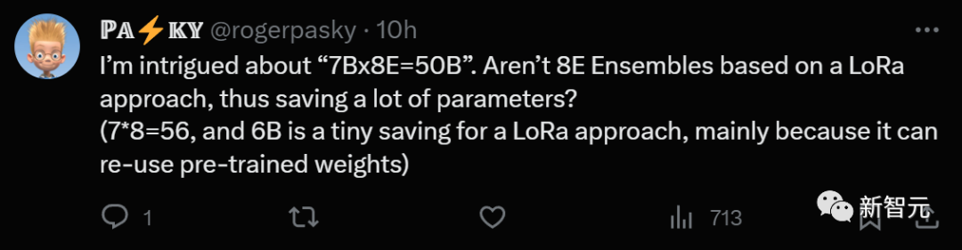 有人表示,对「7Bx8E=50B」的说法很感兴趣。是否是因为此处的「集成」是基于LoRa方法,从而节省了很多参数?