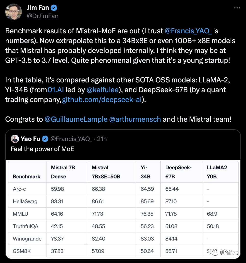 英伟达高级研究科学家Jim Fan推测,Mistral可能已经在开发34Bx8E,甚至100B+x8E的模型了。而它们的性能,或许已经达到了GPT-3.5/3.7的水平。