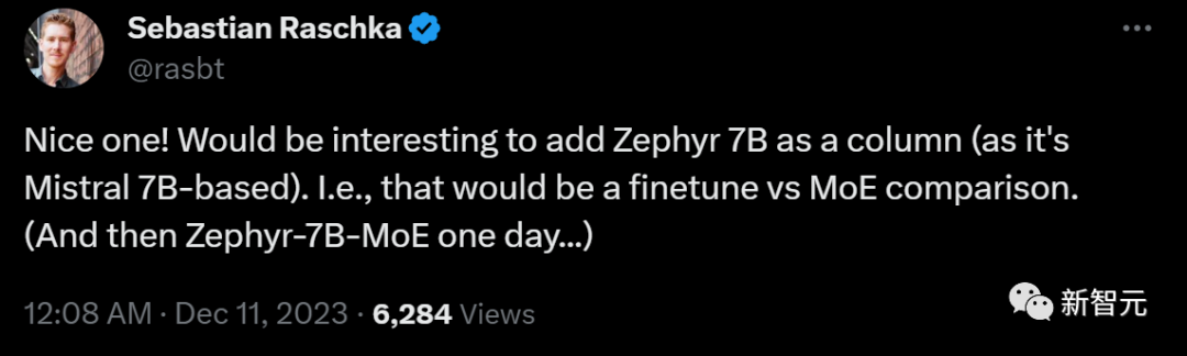 深度学习大牛Sebastian Raschka表示,基准测试中最好再加入Zephyr 7B这一列,因为它是基于Mistral 7B的。这样,我们就可以直观地看出Mistral微调和Mistral MoE的对比。