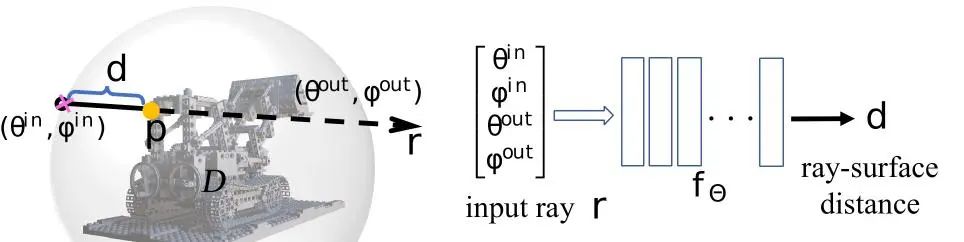 如图1所示,RayDF包含两个网络及一个优化模块。对于主网络ray-surface distance network,只需输入一条射线,即可得到射线起点到射线打到的几何表面点之间的距离值。其中,如图2所示,RayDF使用一个包围三维场景的球对输入的射线进行参数化,将参数化得到的四维球坐标(入射点和出射点)作为网络输入。对于辅助网络dual-ray visibility classifier,输入一对射线和一个几何表面点,预测两条射线之间的相互可见性。这个辅助网络在训练好之后,将在后续multi-view consistency optimization module中起到关键作用。