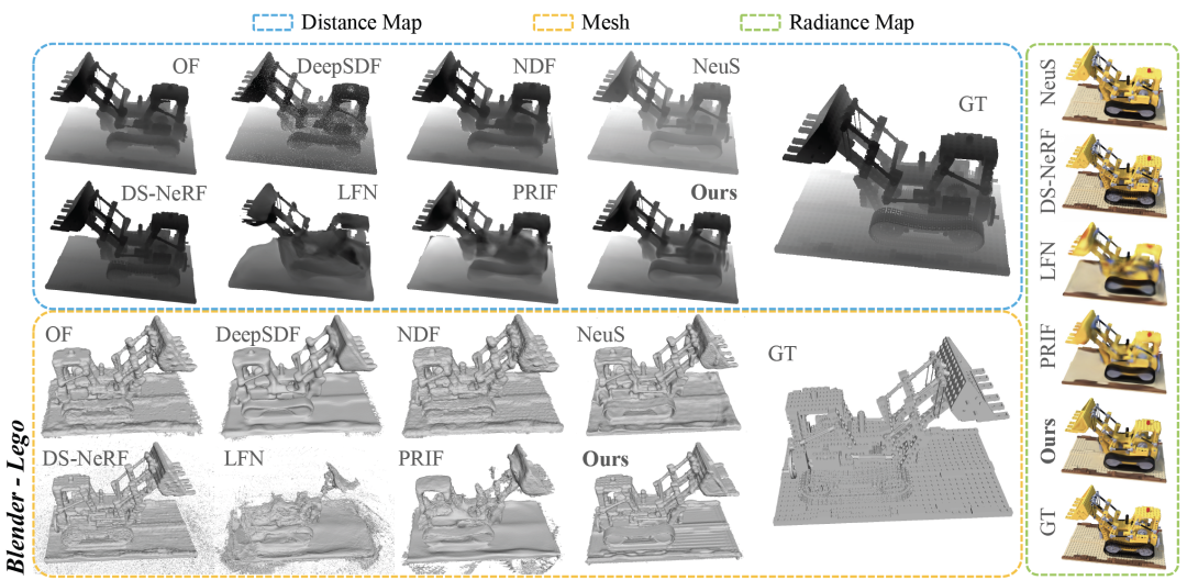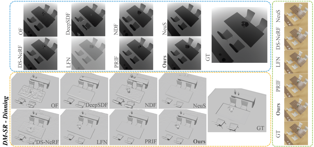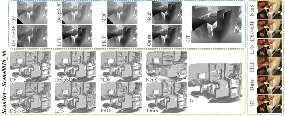 为了验证所提出方法的有效性,本文在三个数据集上进行了实验,分别是object-level的合成数据集Blender [1]、scene-level合成数据集DM-SR [2]、scene-level真实数据集ScanNet [3]。论文选取了七个baselines进行性能对比,其中OF [4]/DeepSDF [5]/NDF [6]/NeuS [7]是基于坐标的level-set方法、DS-NeRF [8]是有depth监督的NeRF-based方法,LFN [9]和PRIF [10]是基于射线的两个baselines。