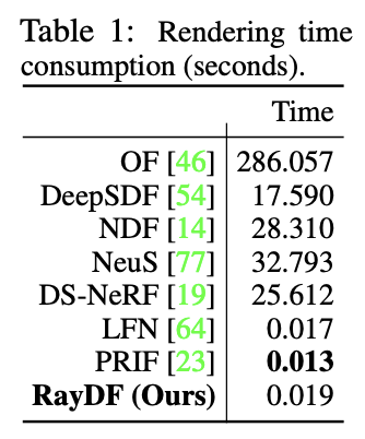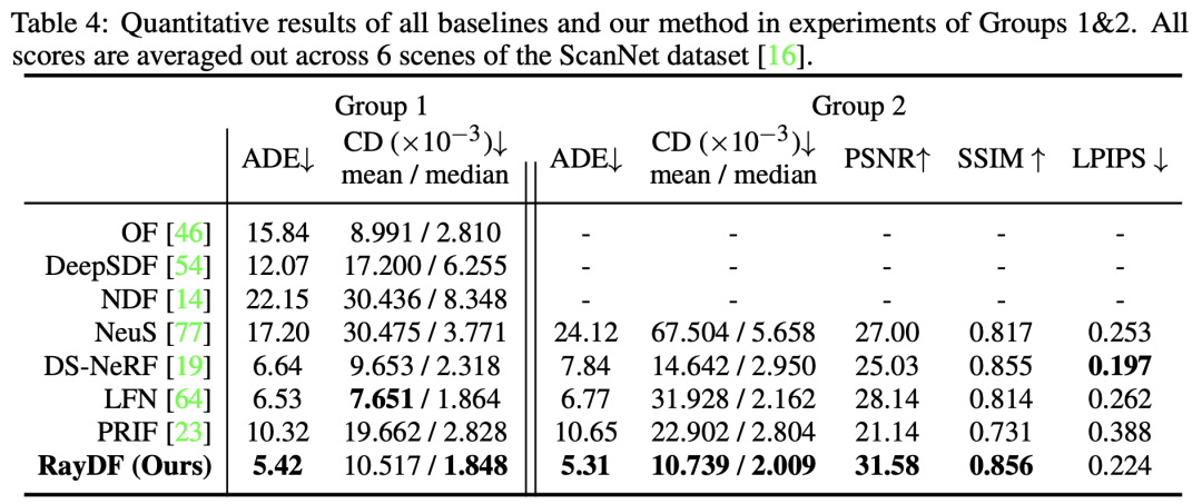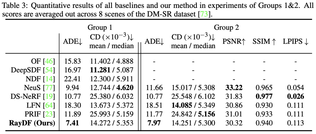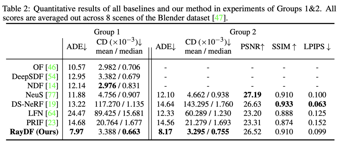 从Table 2和图6可以看出,在Group 1和2中,RayDF在表面重建上取得了更优的结果,尤其是在最重要的 ADE 指标上明显优于基于坐标和射线的baselines。同时在radiance field rendering上,RayDF也取得了与DS-NeRF相当的性能,并优于LFN和PRIF。