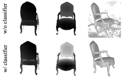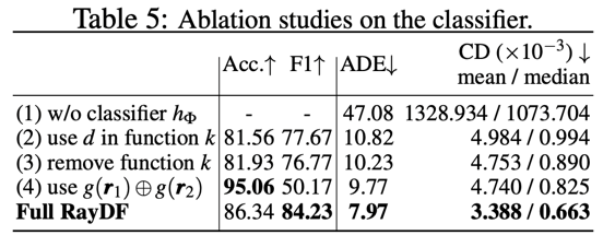 - 在classifier的输入中,选择了输入表面点坐标来作为辅助,如Table 5 (2)和(3)所示,若选择输入表面点距离值作为辅助或是不提供辅助信息,分类器会获得较低的准确率和F1分数,导致为ray-surface distance network提供的可见性信息不够准确,进而预测出错误的距离值。