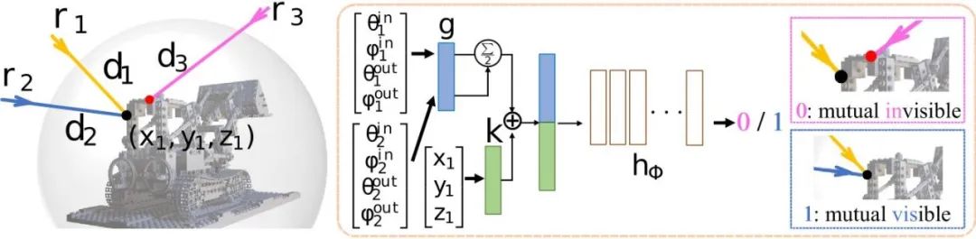 该方法中的辅助网络是一个预测输入的两条射线是否能同时看到一个表面点的二元分类器。如图3所示,将输入的两条射线所得特征取平均值,以确保预测的结果不受两条射线的顺序所影响。同时,将表面点进行单独编码得到的特征拼接在射线特征之后,以增强射线特征,从而提升分类器的准确性。