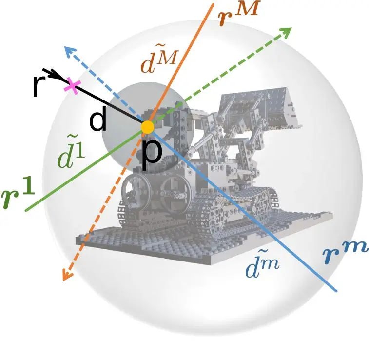 (2) 第二阶段是训练主网络ray-surface distance network使其预测的距离场满足多视角一致性。如图4所示,对于一条主射线及其表面点,以该表面点为球心均匀采样,得到若干条multi-view ray。将主射线与这些multi-view ray一一配对,通过训练好的dual-ray visibility classifier即可得到其相互可见性。再通过ray-surface distance network预测这些射线的ray-surface distance;若主射线与某一条采样射线是相互可见的,那么两条射线的ray-surface distances计算得到的表面点应是同一个点;依此设计了对应的损失函数,并对主网络进行训练,最终可以使ray-surface distance field满足多视角一致性。
