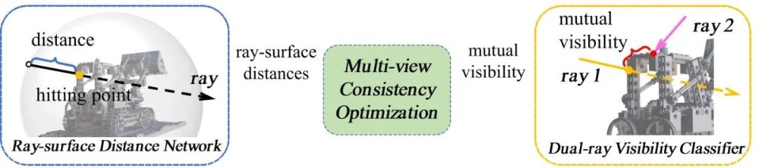 - 设计了全新的双射线可见性分类器,通过学习任意一对射线的空间关系,使得所学的射线-表面距离场能够在多视角下保持几何一致性。