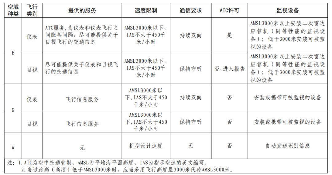 3.飞行要求:①允许仪表和目视飞行;②平均海平面高度3000米以下,指示空速不大于450千米/小时;③仪表飞行的航空器和空中交通管理部门之间必须保持持续双向无线电通信,目视飞行在规定通讯频率上保持守听;④航空器必须安装或携带可被监视的设备;⑤必须报备飞行计划;⑥航空器驾驶员应具备仪表或目视飞行能力及相应资质。