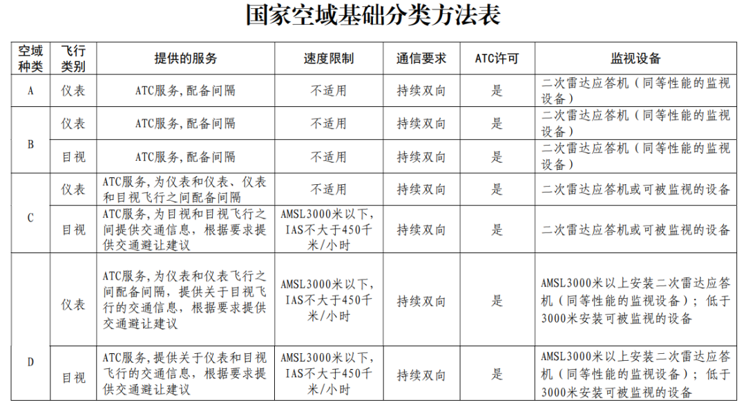 依据航空器飞行规则和性能要求、空域环境、空管服务内容等要素,将空域划分为A、B、C、D、E、G、W等7类,其中,A、B、C、D、E类为管制空域,G、W类为非管制空域。具体如下: