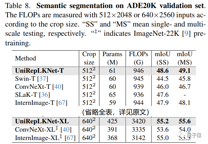 在ADE20K语义分割上,UniRepLKNet的优势相当显著,最高达到55.6的mIoU。与ConvNeXt-XL相比超出了整整1.6。