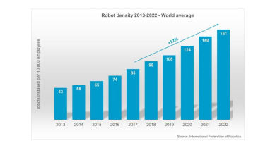 国际机器人联合会主席玛丽娜·比尔 (Marina Bill) 表示:“机器人密度数据揭示了全球自动化状况,使我们能够对地区和国家进行比较。世界各地工厂采用机器人技术的速度令人印象深刻:新的全球平均机器人密度达到每 10,000 名员工 151 台机器人的历史新高,是六年前测量数字的两倍多。”