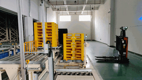 客户载具为铁制灰色料笼,导入未来机器人VNP20堆高式平衡重无人叉车+RCS2.0调度系统,从接驳位叉取料笼转运,并进行两层料笼堆叠。
