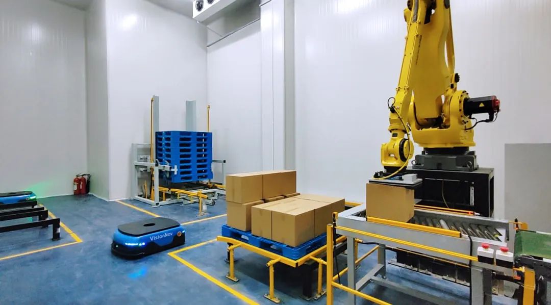 客户导入未来机器人VNP20+VNE20+四向穿梭车+RCS2.0中控调度系统+明眸环境监测系统,对接输送线,助力客户实现入库-出库-装车全流程自动化。