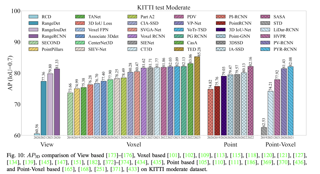 - 准确度:大多数研究文章和综述中都非常关注准确性,这确实非常重要。虽然准确性可以通过AP(平均精度)来反映,但仅考虑AP可能无法提供全面的视角,因为不同的方法由于不同的范式可能表现出显著的差异。如图所示,我们选择了10种代表性方法进行比较,结果表明单目3D物体检测与立体视觉3D物体检测之间存在显著的度量差异。目前的情况表明,单目3D物体检测的准确性远低于立体视觉3D物体检测。立体视觉3D物体检测利用从同一场景的两个不同视角捕获的图像来获取深度信息。相机之间的基线越大,捕获的深度信息范围越广。随着时间的推移,多视角(鸟瞰视图感知)3D物体检测逐渐取代了单目方法,显著提高了mAP。传感器数量的增加对mAP产生了重大影响。