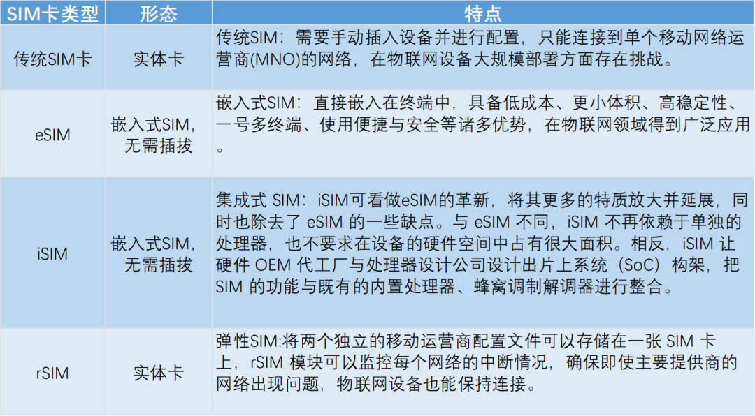 作为为物联网设备提供数据连接和通信功能的介质,SIM卡的重要性无需赘述。而为了满足日益增长的连接需求,SIM卡的形态和功能也在不断进化,衍生出诸如eSIM、iSIM、rSIM 等,笔者用下表对三种SIM卡进行比较: