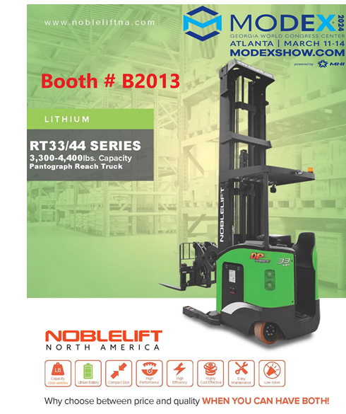 2024年3月11日至14日,请莅临美国乔治亚世界会议中心(Georgia World Congress Center)的亚特兰大,参观NOBLELIFT的展位。这将是一个了解NOBLELIFT最新产品和技术、探讨行业趋势、寻找合作机会的绝佳平台。加入我们,共同探索供应链和物料搬运行业的未来。